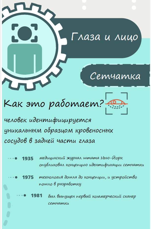 Сітківка: У цій біометрику людина ідентифікується унікальним зразком кровоносних судин в задній частині ока. Сканування сітківки в точності поступається лише ДНК. Для сканування сітківки в око світить промінь інфрачервоного світла з низькою енергією. Сітчасті кровоносні судини поглинають світло легше, ніж оточуюча тканина, створюючи відображає відбиток зразків сітківки.