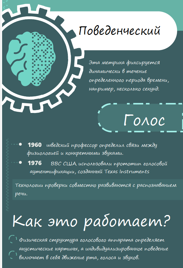 Голос: це популярна біометрична методика для віддаленої аутентифікації з-за широких можливостей доступу та передачі даних для телефонів і комп'ютерних мікрофонів. Фізична структура голосового апарату визначає акустичні картини, а індивідуалізоване поведінка включає в себе рух рота, голосу і звуків.