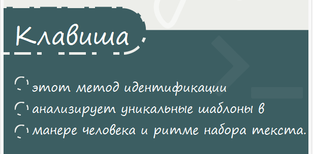 Клавіша: цей метод ідентифікації аналізує унікальні шаблони в манері людини і ритмі набору тексту. Це відноситься до 1960-м рокам, коли телеграфним операторам вдалося ідентифікувати один одного по ритму натискання. Це не перевірка справжності pass / fail, а вимір достовірності.