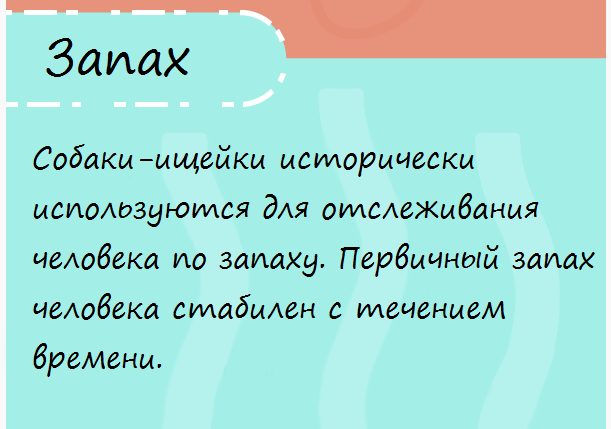 Запах: Собаки-шукачі історично використовуються для відстеження людини за запахом. Первинний запах людини стабільний з плином часу. Вторинні запахи містять складові частини, які змінюються з урахуванням дієти і факторів навколишнього середовища. Третинні запахи отримують ззовні (лосьйони, мило, парфумерію тощо). Система собачого оповіщення і раніше вимагає досліджень по сигнатурі цільового запаху і механізму виявлення.