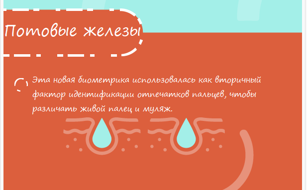 Потові залози: Ця нова біометрика використовувалася як вторинний фактор ідентифікації відбитків пальців, щоб розрізняти живий палець і муляж.