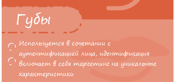 Губи: Використовується в поєднанні з аутентифікацією особи, ідентифікація включає в себе націлювання на унікальні характеристики, такі як розмір верхньої і нижньої губ, борозен, канавок і відстань між лініями і штрихами.